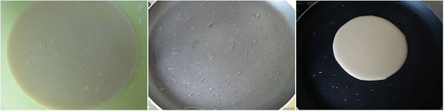 Appena la nostra pastella sarà ben uniforme, mettiamola da parte e lasciamola riposare qualche minuto. Nel frattempo, prendiamo un padellino antiaderente, se ne avete uno andrà benissimo quello per le crepes, ungiamolo leggermente con un po’ di burro o con un filo d’olio di semi, togliamo l’eccedenza con della carta assorbente, quindi mettiamolo sul fuoco a fiamma medio alta. Prendiamo un mestolino di pastella e versiamola al centro del padellino.