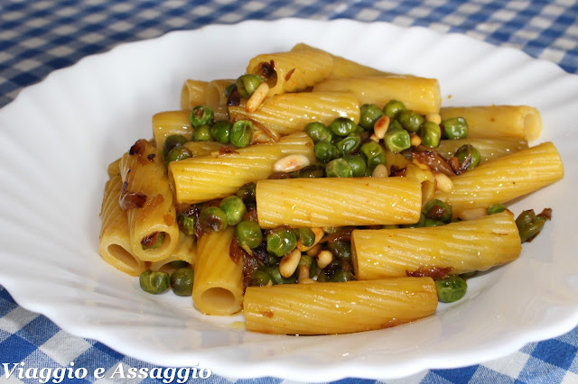Cook pasta in salted water. In a pan, toast pine nuts for few minutes. Put aside. In the same pan, fry chopped onion, then add peas, salt and pepper and cook for about 10-15 minutes. Drain pasta al dente, transfer it to the pan, add saffron dissolved in a water and grated rind of half a lemon. Saute for few seconds. Serve the dish with a drizzle of good extra virgin olive oil.