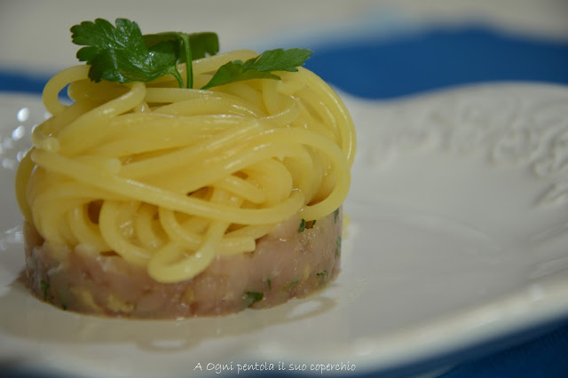 Impiattare con alla base la tartare di palamita e sopra gli spaghetti all’acqua di limone.