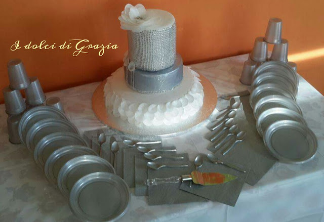 Solo il piano alla base della torta è edibile, i piani superiori sono in polistirolo rivestito di pasta di zucchero e lì, visto che non c’era nulla da addentare, mi sono sbizzarrita con decorazioni in ostia e strass.