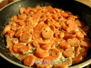 In una padella sciogliere il burro, aggiungere la farina e mescolare bene. Unire le carote, lasciarle cuocere 2 minuti, unire il latte e l’acqua, salare e cuocere su fiamma medio-bassa e a padella semi coperta per i primi 10 minuti, togliere poi il coperchio e finire la cottura. Il latte con la farina formeranno una deliziosa cremina.