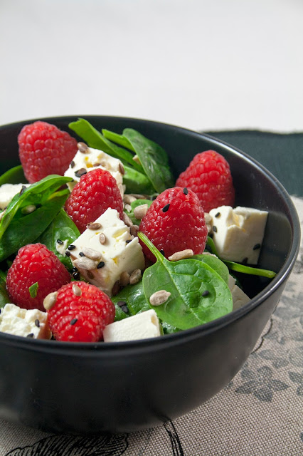 Dopo il post di ieri sui benefici dei lamponi, oggi m’era venuta voglia di comperarmene una vaschetta. Non avevo intenzione di accendere il forno anche oggi, sicché questa insalata è nata così, senza pensarci più di tanto.