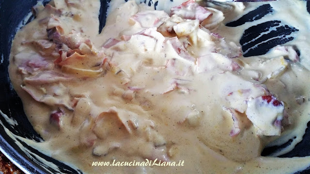 Soffriggere nellolio la cipolla tritata, aggiungere lo speck tagliato a straccetti, dopo 1 minuto aggiungere la panna e scioglierci lo zafferano, se si addensa troppo aggiungere del latte, quindi pepe nero e parmigiano.