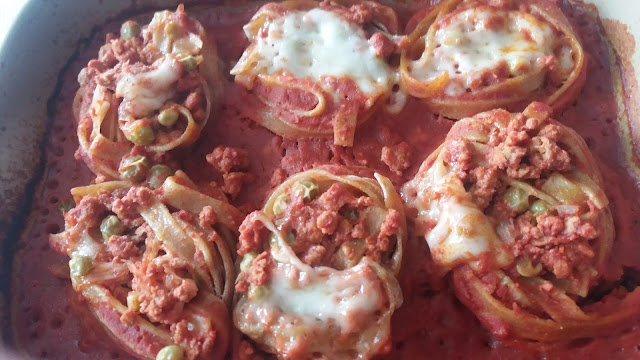 Poggiare ora i nidi di pasta in una teglietta di coccio colma di sugo e cercare delicatamente di riempirne il vuoto centrale ,con quanta piu farcia ,coprire ogni nido con un pezzetto di fiordilatte