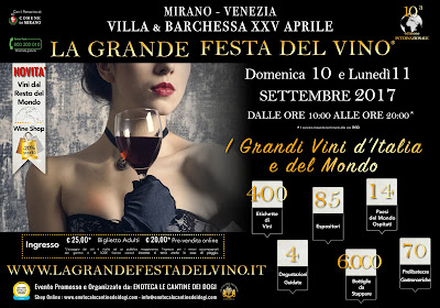 Cari lettori, ben ritrovati, ho il piacere di segnalarvi un interessante evento che andrà a chiudere questa torrida estate 2017 LA GRANDE FESTA DEL VINO che con questa arriva alla sua 10° edizione !!!