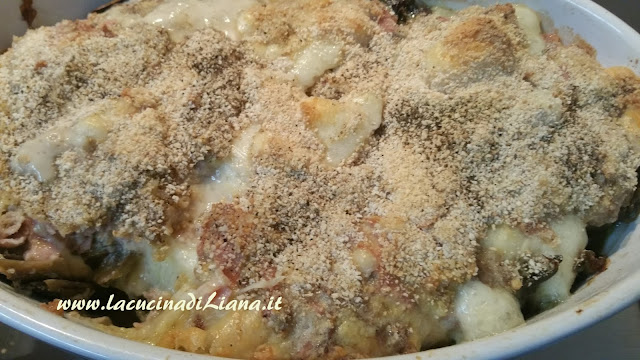 Ungere di olio una teglia, coprire con uno strato di carciofi, ricoprire con il composto di carne e formaggio, spolverizzare con pangrattato e infornare a 200 gradi per 30 minuti.