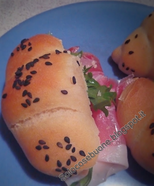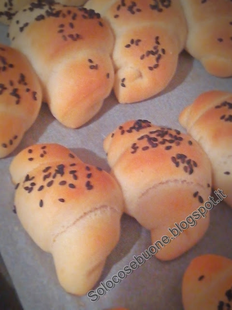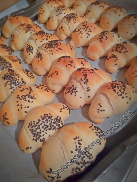 Spennelliamo con delicatezza i cornetti con un po’ di latte o acqua e spolverizziamo con i semi di sesamo . Facciamo lievitare ancora fino al raddoppio.