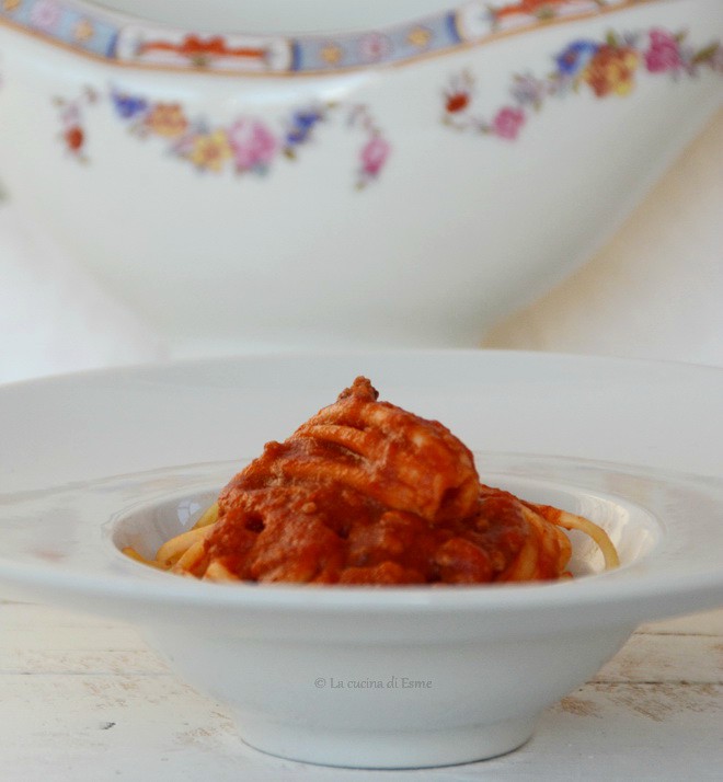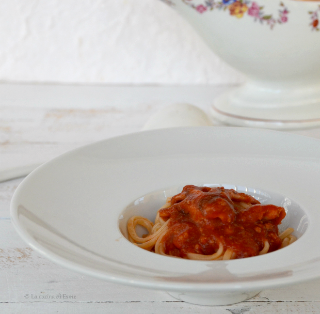 Per questa preparazione prediligete moscardini o totani, comunque tagli piccoli. Iniziate pulendo ben bene il pesce, separando anche i ciuffi dalle sacche. Frullate, con l’aiuto di un mixer, più della metà dei ciuffi (quelli più grossi) e tagliate invece in strisce le sacche. In una pentola mettete a soffriggere aglio e olio, quando quest’ultimo si sarà imbiondito spegnete il gas e lasciate raffreddare l’olio (il pesce non entrando in contatto diretto con olio già caldo manterrà la sua tenerezza). A questo punto eliminate l’aglio e unite il pesce frullato, riaccendete il gas e mescolate con una spatola di legno fino a sgranarlo completamente, quando avrà cambiato colore date una spruzzata di vino, fate evaporare, poi unite la passata di pomodoro e il resto del pesce, salate unite un pizzico di zucchero e lasciate cuocere semicoperto per 15/20 minuti. Lessate la pasta, in abbondante acqua salata, scolatela conditela con il ragù di pesce e servite subito. Ovviamente il ragù in eccesso potrà essere conservato in frigorifero per un paio di giorni o ancora meglio surgelato avendo utilizzato pesce fresco.