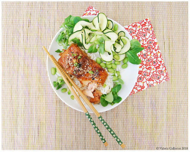 Disponete i tranci sopra il riso, guarnite con la glassa, i semi di sesamo e servite con le zucchine e gli edamame.