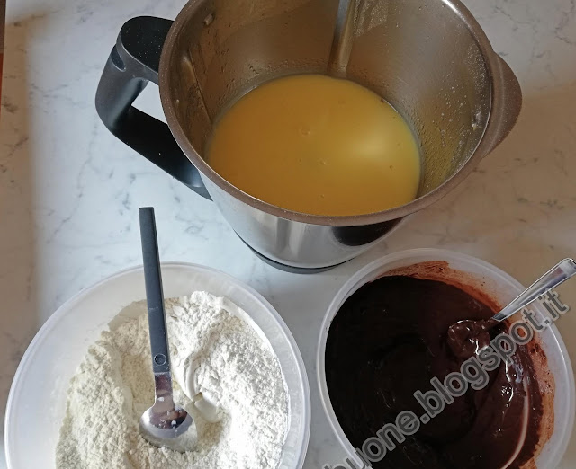 A questo punto aggiungete il mix di farina , lievito e bicarbonato, e mescolate fino a che tutta la farina sarà ben incorporata, quindi aggiungete il mix di acqua e cacao. e mescolate per 1 minuto.