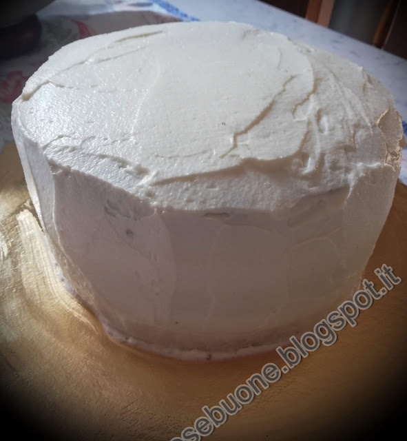 Appoggiate il primo disco di torta direttamente sul piatto da portata e farcitelo con una spirale di crema (come vedete nella foto ), poi un disco di torta e poi la crema, poi un altro disco torta e poi la crema, fino a completare con l’ultimo disco di torta.