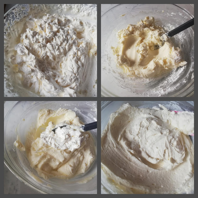 Mischiate bene il philadelphia con il mascarpone e lo zucchero a velo, a mano o con le fruste elettriche al minimo. Unite la panna montata e mischiate delicatamente con un cucchiaio di legno, dal basso verso l’alto. Mettete in frigo per 20 minuti.