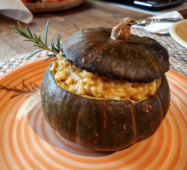 Oggi vi propongo il classico risotto servito nella zucca. Questa versione però, ha due caratteristiche interessanti: la prima è che le zucca in questione è “monoporzione” così ognuno ha la propria ed è molto più comodo servirla, l’altra è che si mangia tutto! Si, perché ho cotto le zucchette in forno (dopo averle svuotate dalla polpa). La varietà che ho utilizzato è la Delica e la sua buccia si può mangiare. Quindi mentre le piccole zucche cuocevano in forno, io preparavo il risotto. Una volta pronto ho riempito le zucche che hanno mantenuto il riso caldo e fumante!