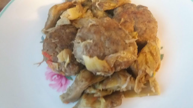bassa con ,cipolla,vino ,carciofi,,un pizzico di gomasio e zenzero , acqua a coprire e portare