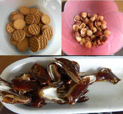 Spezzettare grossolanamente i biscotti. Spezzettare anche la frutta secca, io ho usato delle nocciole, datteri e fichi secchi.