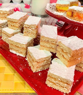 Prima di servire, cospargere la superficie di zucchero a velo e tagliare il dolce a rettangoli.