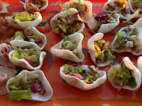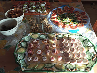 - Rotolini di speck spalmati di Philadelphia + olivette sarde in alcuni e pomodori secchi in altri, poi appoggiati su pezzetti di pane carasau,