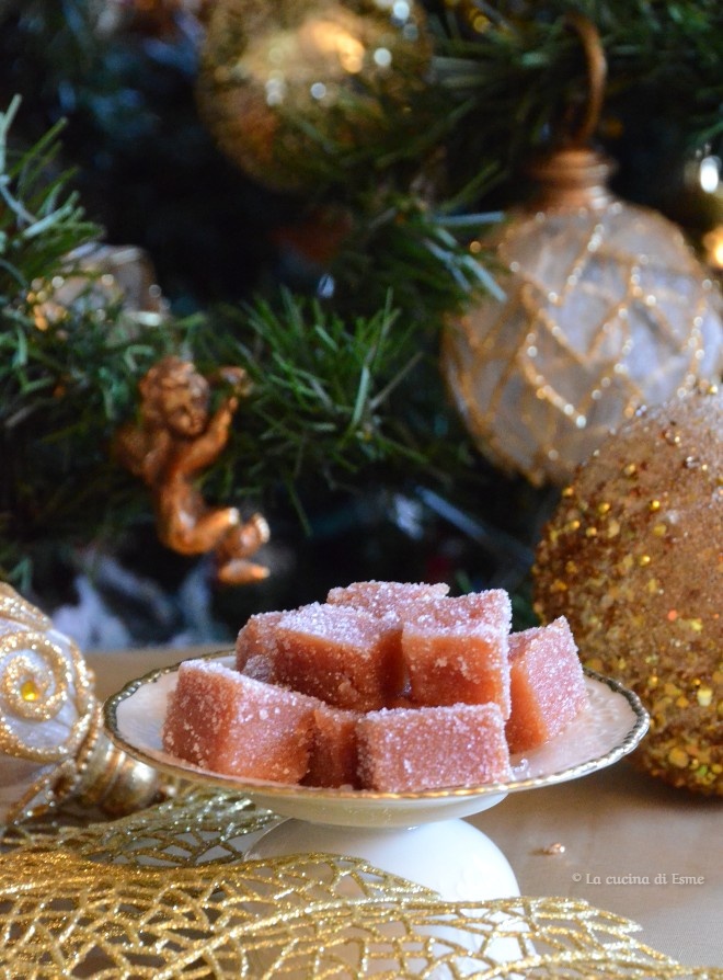 Scegliete mele cotogne mature, preferibilmente integre e senza macchie. Lavatele sotto l’acqua corrente, facendo attenzione ad eliminare bene tutta la peluria. Tagliate le mele a tocchi grossi senza sbucciarle, eliminando solo il torsolo ed i semi. Prendete una pentola di acciaio dal fondo spesso e dai bordi alti, mettete i pezzi di mela e ricopriteli di acqua, aggiungete il succo di limone, coprite e cuocete per circa 40 minuti su fiamma moderata, o fino a quando saranno tenere ma non sfatte. Scolate i pezzi di mela con un mestolo forato e passateli col passaverdura (disco fine) fino ad ottenere una purea, pesatela e poi mettete la purea in una pentola con l’80% del suo peso in zucchero (per 1 kg di polpa di mele occorrono 800g di zucchero) unite qualche goccia di limone e cuocete a fuoco basso, mescolando continuamente, per 30/40 minuti. Man mano che la cotognata cuoce, la purea diventerà più scura e lucida (sarà pronta quando presa con un cucchiaino non scivolerà via). Una volta pronto versate il composto in uno stampo quadrato a bordo basso, foderato preventivamente di carta forno leggermente inumidita, livellate la cotognata dandogli l’altezza di un paio di centimetri, coprite con un coprivivande a velo e lasciate raffreddare completamente. Per cinque o sei giorni, una volta al giorno, girate la cotognata su sé stessa, al fine di farla asciugare completamente. Una volta che la cotognata sarà ben asciutta, tagliatela a cubetti regolari e poi passate ogni cubetto nello zucchero semolato ricoprendolo ben bene. Conservate in una scatola di latta. Buon appetito!