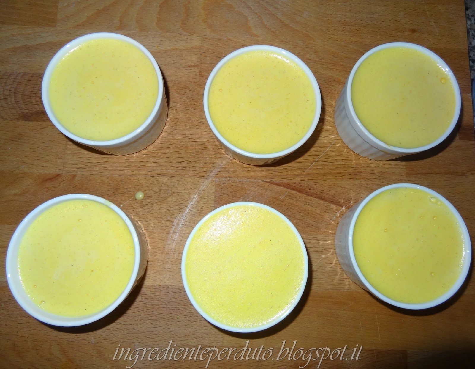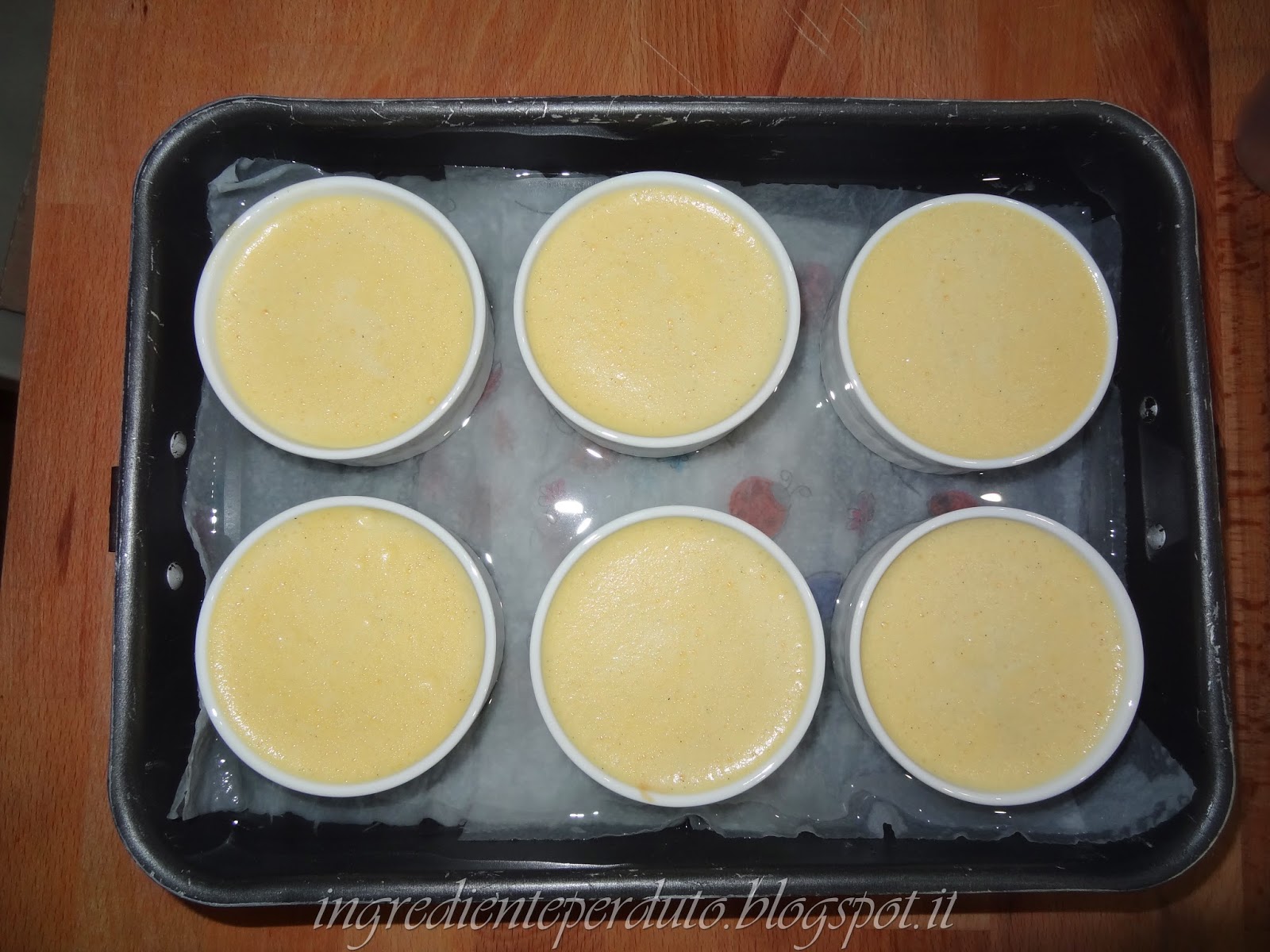 cuocere a bagno-maria: in una teglia da forno con i bordi alti mettete alcuni fogli di carta assorbente da cucina poi posizionate gli stampi e versate nella teglia tanta acqua sino ad arrivare a metà altezza degli stampini.