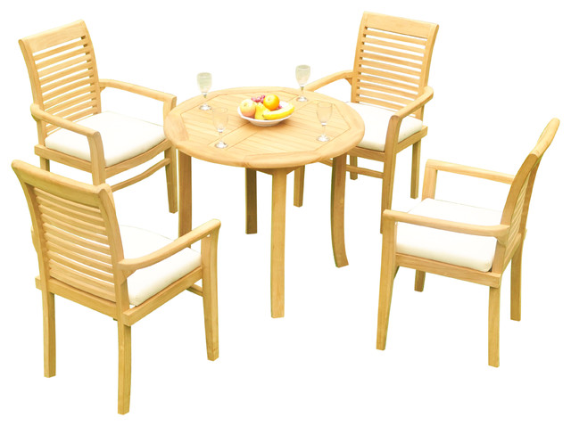 5 Piece Outdoor Teak Dining Set 36 Round Table 4 Mas Stacking Arm Chairs