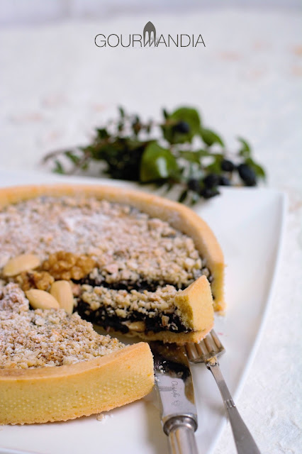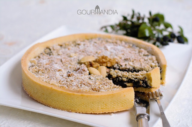 Riempi il guscio con la confettura e ricopri la superficie con le mandorle e noci tritate. Metti in forno a 160 °C per 30 minuti circa. Sia la modalità statica, sia quella ventilata possono dare entrambe ottimi risultati. In questa occasione ho abbinato le due, cuocendo nei primi 20 minuti con il forno statico e poi passando al ventilato.