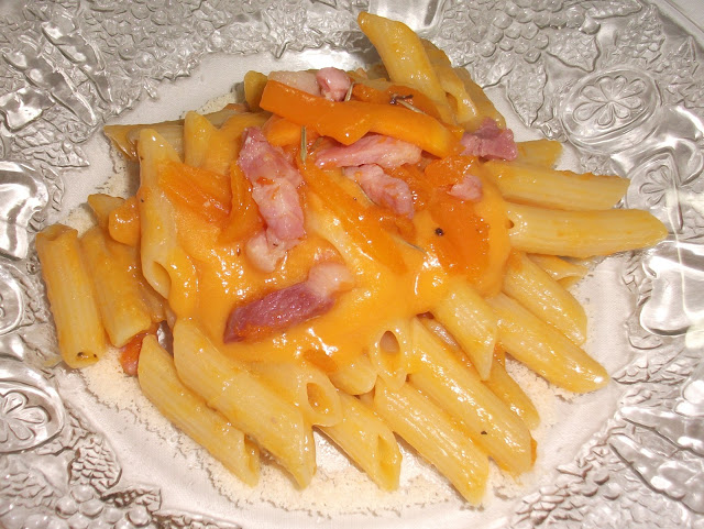 | Penne rigate con Crema di Zucca, Pancetta e Rosmarino |