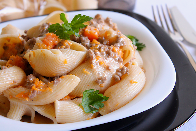 | Lumaconi con Ragù cremoso di Vitellone e Zucca |