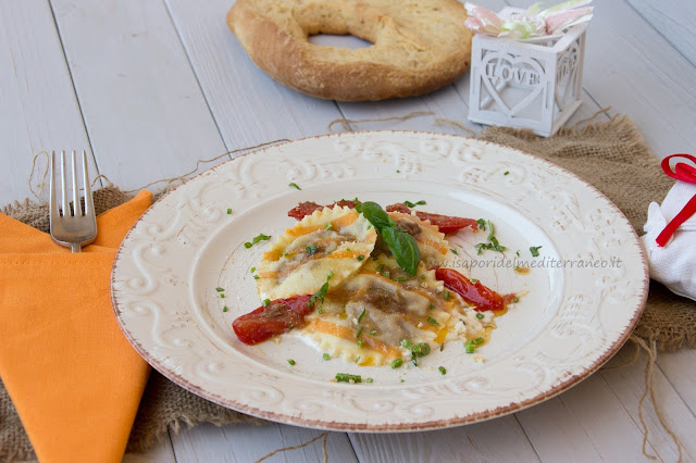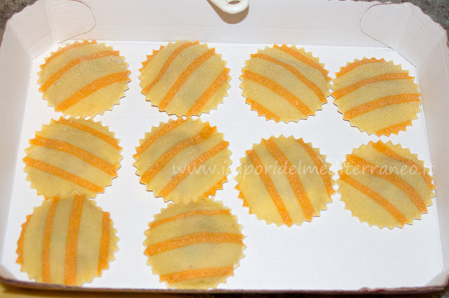 A questo punto ponete la sfoglia sul piano di lavoro, e con un cucchiaino mettete ;il ripieno sulla sfoglia; spennellate dove avverrà la sigillatura con dell’albume d’uovo sbattuto e coprite con la sfoglia rigata di peperoni , premete bene sui bordi per saldare la pasta e tagliate con lo stampo per i ravioli.