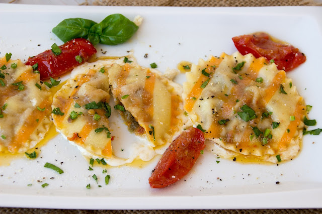 Cuocete i ravioli in abbondante acqua salata per 5-6 minuti, scolateli e passateli delicatamente nel soffritto con le acciughe. In un piatto da portata adagiate i ravioli al peperò sulla crema di bufala; al centro di ogni raviolo con un cucchiaino versate un pò di sugo all’acciuga, guarnire con il pomodorino , basilico, pepe e prezzemolo tritato finemente, finite con una piccola grattugiata di fresella locale al finocchietto.