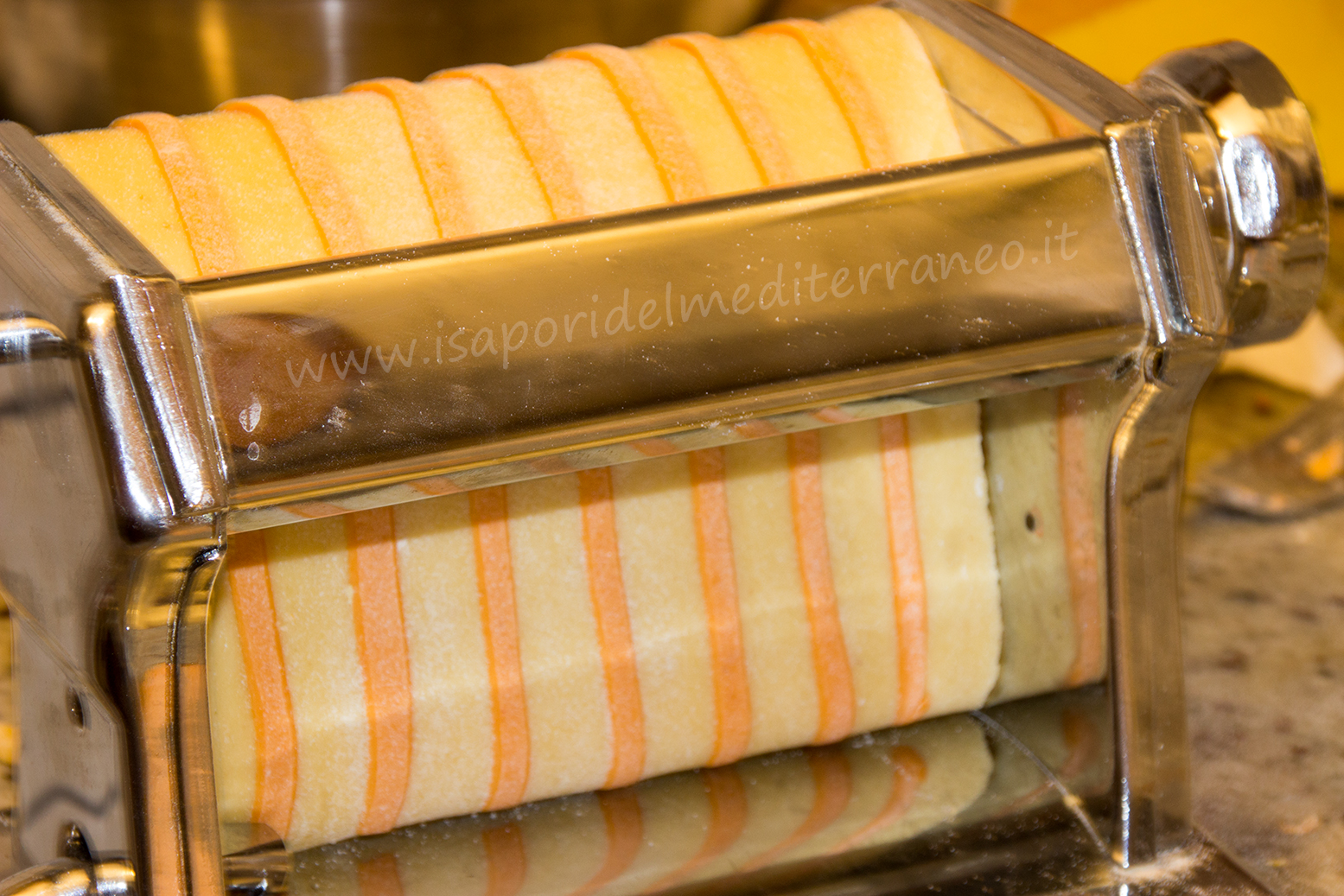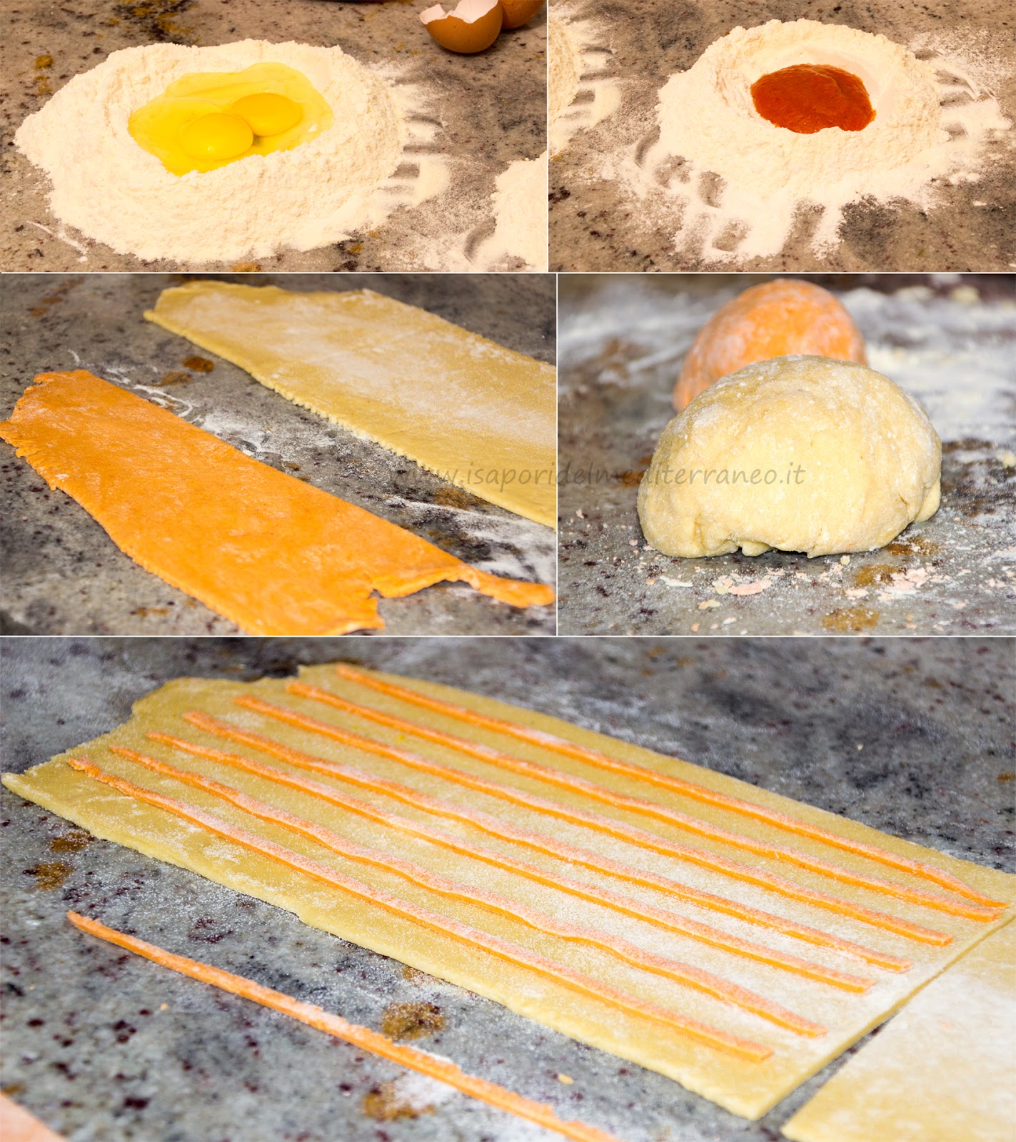 Sulla spianatoia fate un’ altra fontana con farina 0 e semola rimacinata, al centro aggiungete il peperone spellato frullato, con una forchetta incominciate a incorporare la farina partendo dai bordi della fontana. Quando avete incorporato gran parte della farina incominciate a impastare con le mani, lavorando bene il composto per circa 10 minuti fino ad ottenere un impasto omogeneo. Lasciate l’impasto riposare sulla spianatoia coperto a campana con una ciotola per almeno 1/2 ora prima di stendere la pasta.