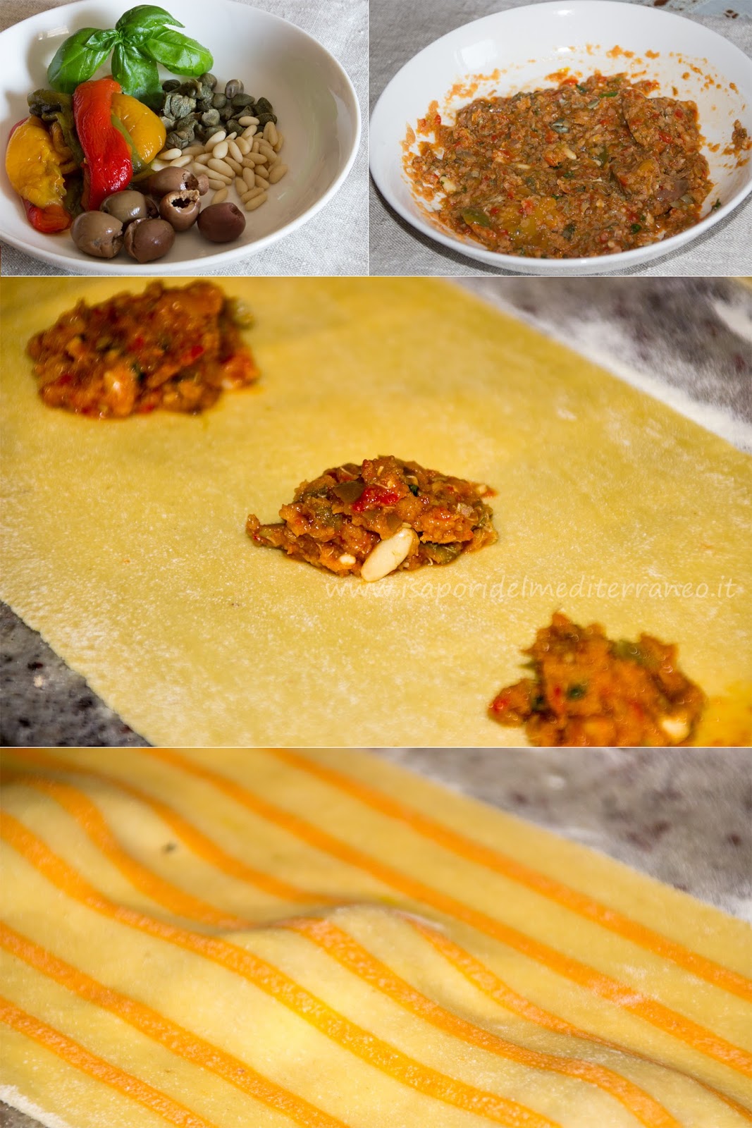 Ingredienti sfoglia gialla100 g farina “0″100 g farina di semola rimacinata2 uovasfoglia di peperone 50 g farina “0″50 g farina di semola rimacinata100 g di peperone rosso quadrato di CarmagnolaIngredienti per il ripieno200 g di peperoni gialli, rossi e verdi quadrato di Carmagnola30 pinoli25 capperi6 olive di Gaeta2 cucchiai di fiocchi di patate2 cucchiai di olio extra vergine di olivabasilicosaleCrema di Mozzarella150 g di Mozzarella di Bufala80 ml di crema da latteper condire 4 filetti di acciughe2 pomodoriolio extra vergine di olivaprezzemolopepefresella con finocchietto