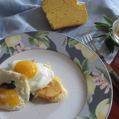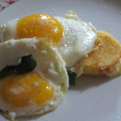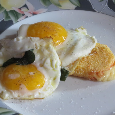 In un’altra padella scaldate l’olio E.V.O. oppure 40 gr di burro con 3/4 foglie di salvia, rompete le uova e cuocetele per alcuni minuti, l’albume deve rimanere bianco e sodo mentre il tuorlo di un bel rosso e semiliquido.