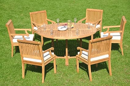 New 7 Pc Luxurious Grade A Teak Dining Set 60 Round Table And 6 Stacking Arbor Arm Chairs Whdsab7