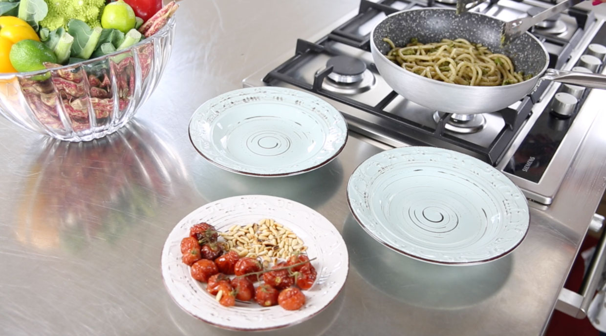Pici con broccoletti, alici, pinoli tostati e pomodorini confit
