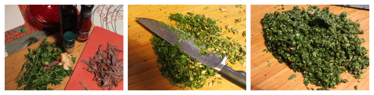 Dopo aver strizzato il pane dovrete unirlo al prezzemolo, a due filetti di acciuga, al peperoncino e al pizzico d’aglio in polvere (o lo spicchio pulito) su di un tagliere. Ora con la mezzaluna o con un coltello affilatissimo dovrete tritare tutto il più finemente possibile, prendetevi il vostro tempo e fate un lavoro accurato. Alla fine di questa operazione avrete ottenuto quasi una pasta verde. Il pane serve proprio a dare consistenza e cremosità alla salsa.