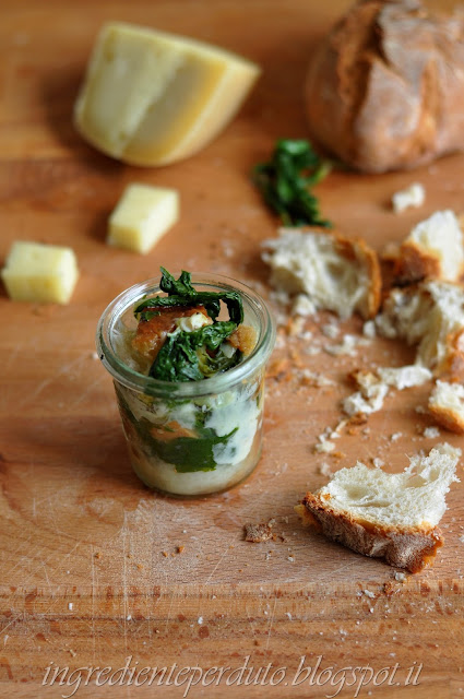 Ho messo, in un barattolo di vetro da trasferire poi in forno, strati di pane raffermo bagnato con l’acqua di cottura alternato alle erbe, tocchetti di pecorino, sale e pepe.