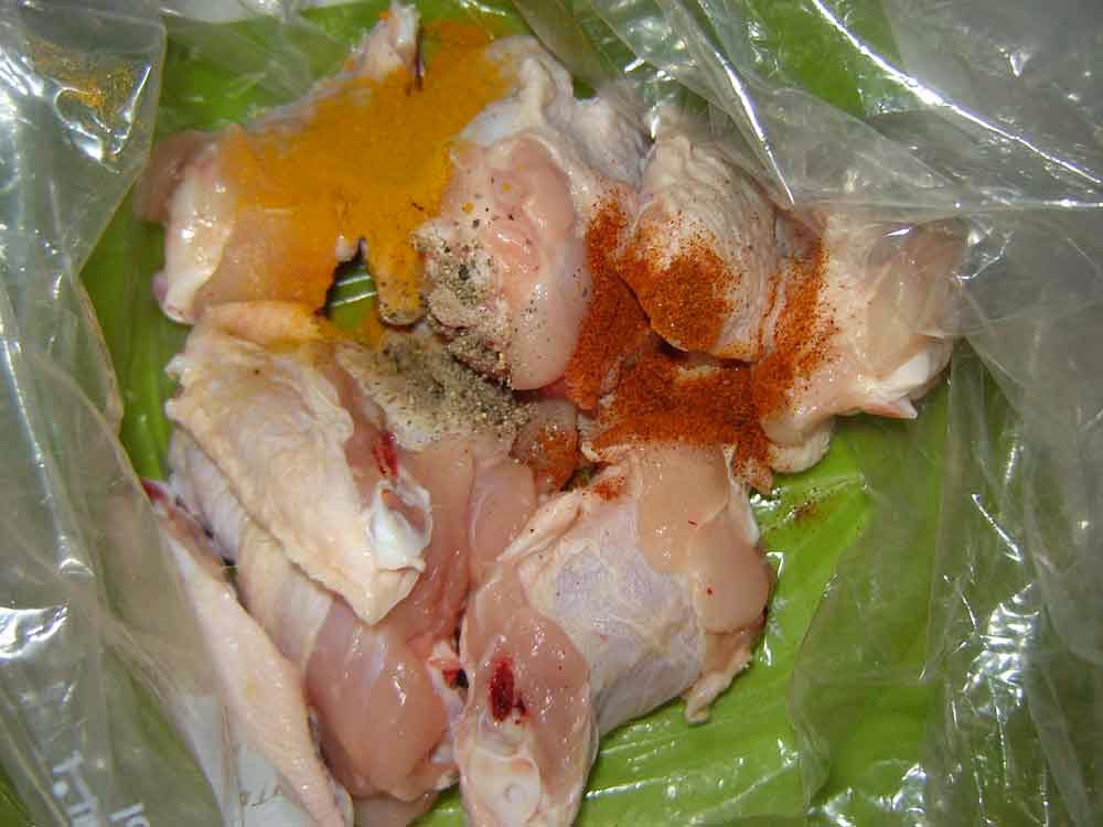 English. Place the chicken wings in a plastic bag. Pour the powders inside (paprika, black pepper and turmeric), shake well and let the wings marinate for about half an hour.