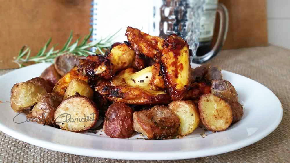 English. Meanwhile, let’s make the sauce. Place in a bowl the soy sauce with honey, vinegar, tomato puree, chili powder and olive oil. Combine well all the ingredients. After ten minutes, take the tray out of the oven and spread the sauce upon both sides of the wings. Bake for 15 minutes more. You can serve the chicken wings with baked potatoes (see related post) and a yogurt and mint deep. Enjoy your meal!
