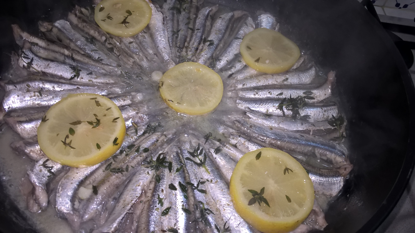 Prendete le alici, privatele della testa e delle interiora, sistematele su una teglia antiaderente con un filo d’olio, salate (pochissimo), cospargete con foglioline di timo e fette di limone (biologico); potete cuocere a fuoco dolce oppure al forno, senza esagerare con la temperatura. Bastano 8/10 minuti. Finito. Potrete gustare un pesce dal gusto molto deciso e delicato nello stesso tempo, valorizzato al meglio con il profumo dei limoni che in questo periodo, in Sicilia, stanno dando il meglio di se’.