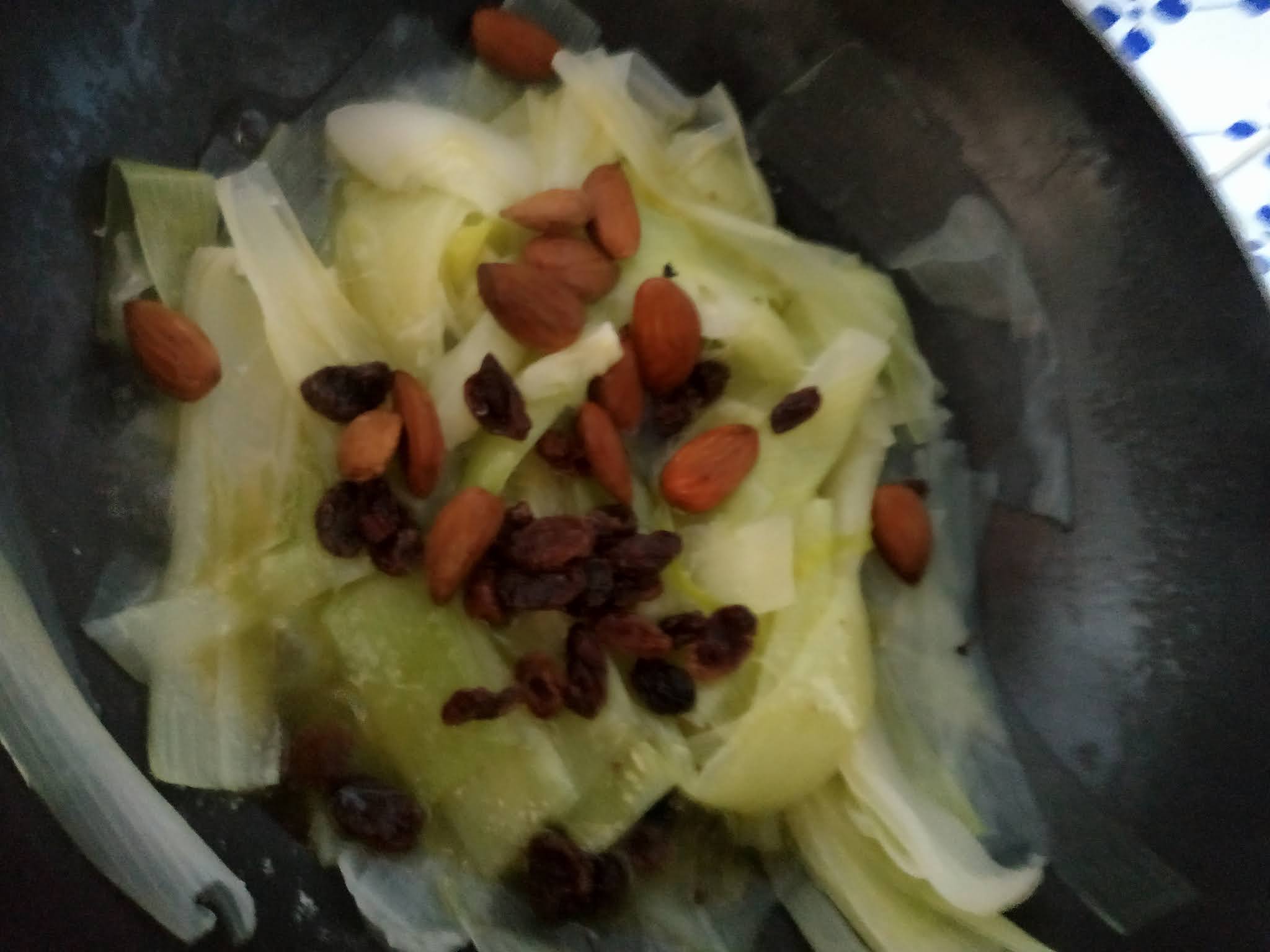 Quando saranno morbidi, aggiungere le mandorle e l’uvetta, il miele e fate sfumare con una spruzzata d’aceto. Fate raffreddare ( in questo frattempo si insaporiranno ulteriormente).