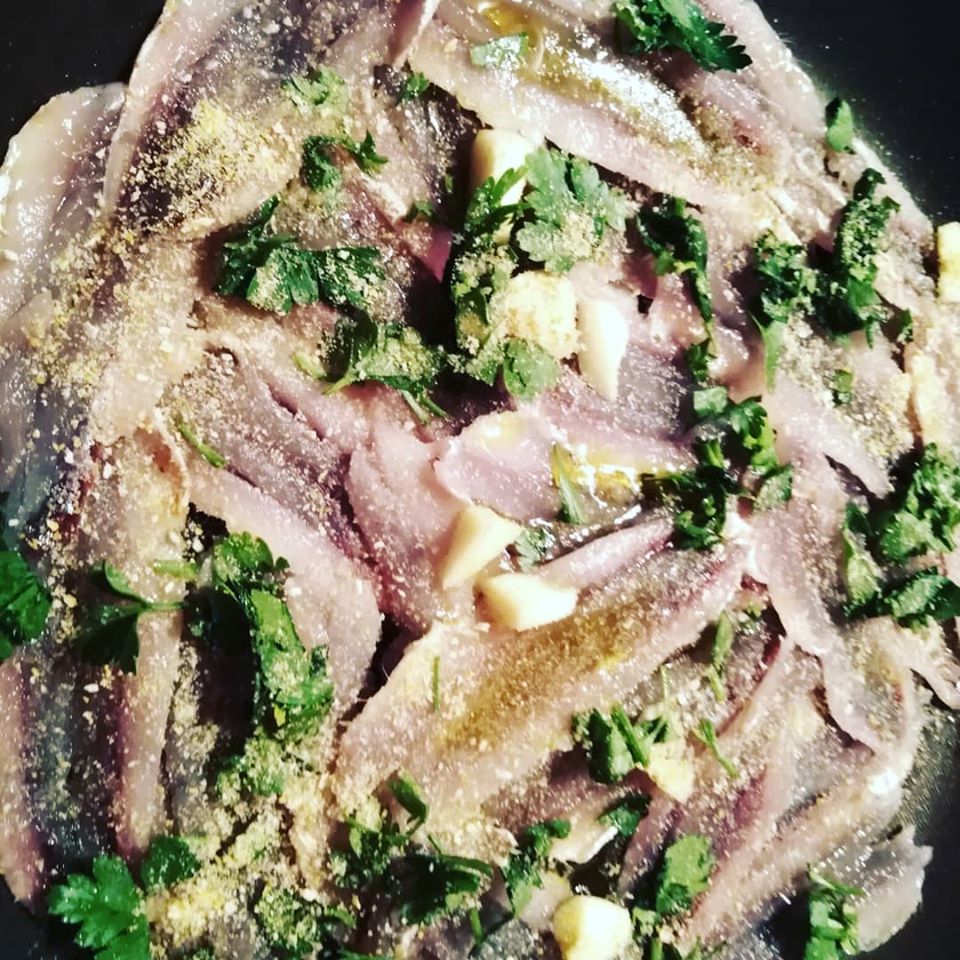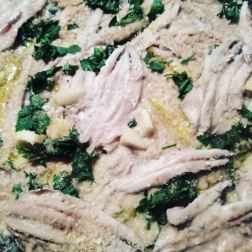 Lavate, pulite le alici ed apritele, disponetele in una tortiera e/o tegame basso in quanto la cottura deve essere omogenea.
