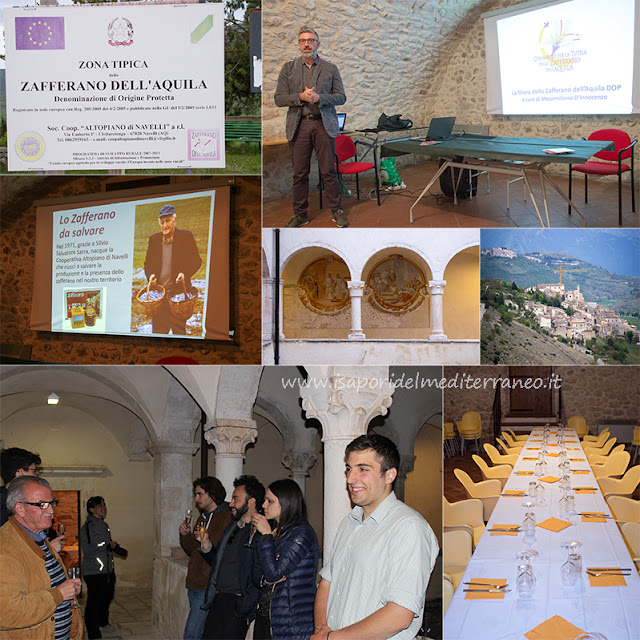 Terminata la visita ci siamo spostati alla volta di Civitaretenga, antico borgo di 200 abitanti appartenente all’unica frazione di Navelli. Nell’Ostello del Convento di S. Antonio abbiamo partecipato all’evento ”vi presentolo zafferano” diretto dal presidente del consorzio di tutela dello zafferano D.o.p dell’Aquila Massimiliano D’Innocenzo. Al convegno era presente anche il presidente e il consiglio direttivo della “Cooperativa Altopiano di Navelli”, la stessa che confeziona lo zafferano D.o.p nelle bustine per poi partire per tutto il mondo. La cooperativa è composta da 80 soci dislocati in tutta la zona di produzione dello zafferano dell’Aquila D.o.p, tutti i soci sono agricoltori e trasformatori del prodotto. Il consorzio di tutela, per incentivare i giovani ed avvicinarli a questo tipo di agricoltura, da tre anni e in via sperimentale, dona a 10 giovani 50 kg di bulbi ogni anno, ottenendo un buon riscontro per l’adesione al consorzio di tutela.
