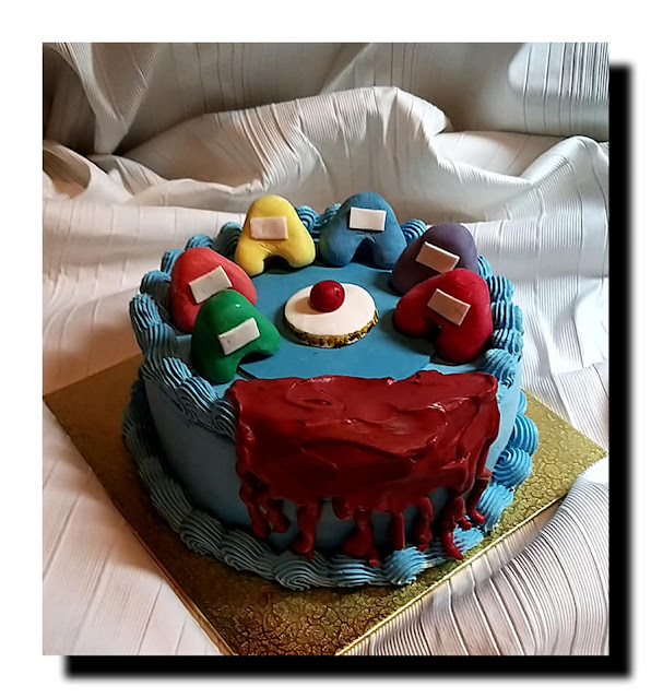 Ricoperta con panna colorata, mentre gli omini sono in pasta di zucchero.