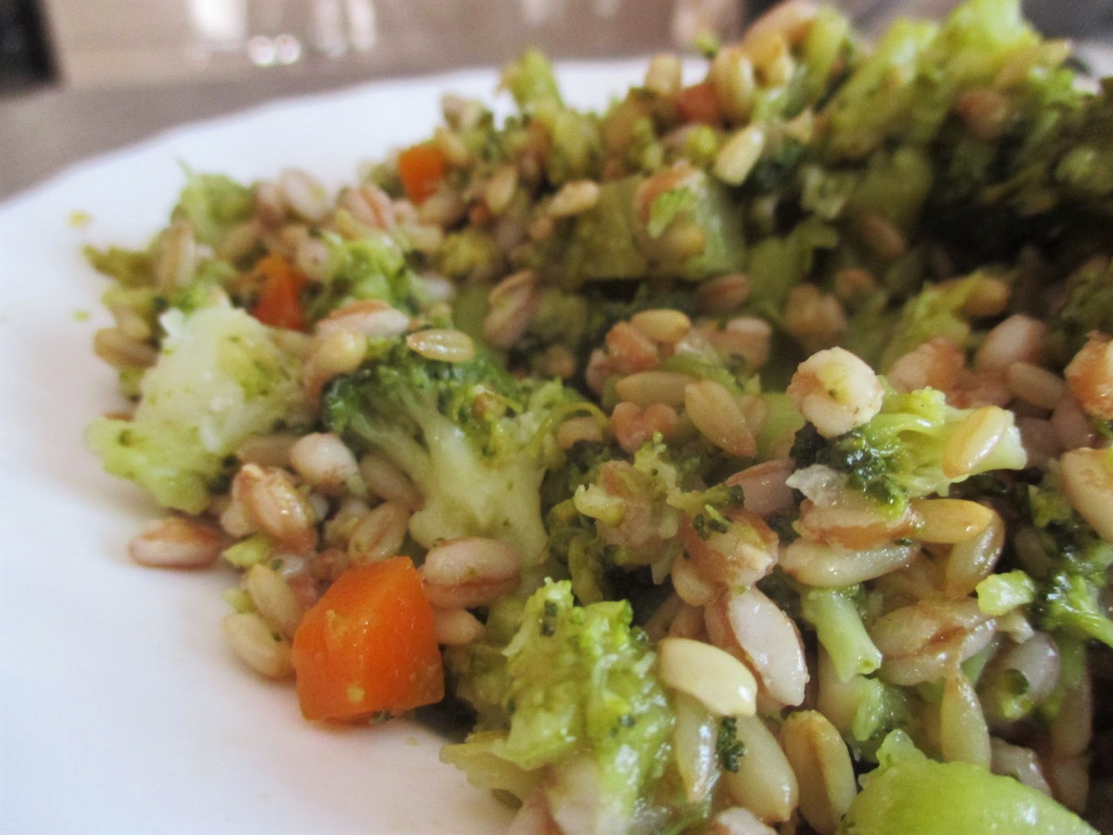 2) Il giorno dopo, eliminate l’acqua e cuocete i cereali al dente. Trasferite il tutto in una insalatiera e unite i broccoli tagliati a pezzi non molto grandi e le carote tagliate a cubetti. Condite con olio e aceto, salate, pepate quindi servite a temperatura ambiente.