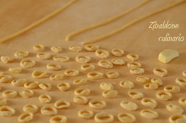 Produrre dei filocini sottili di pasta, lo spessore sarà circa di 2mm, (avere le mani leggermente unte aiuterà la produzione). Effettuato una bisciolina di pasta, subito dovrà essere utilizzata per produrre gli anellini, in pratica si gira il filoncino attorno al dito, si salda e si strappa, formando tanti piccoli anellini (fare 1 biscolina alla volta, comporre gli anellini e poi fare una seconda bisciolina, altrimenti l’impasto si secca e gli anellini non si saldano correttamente).