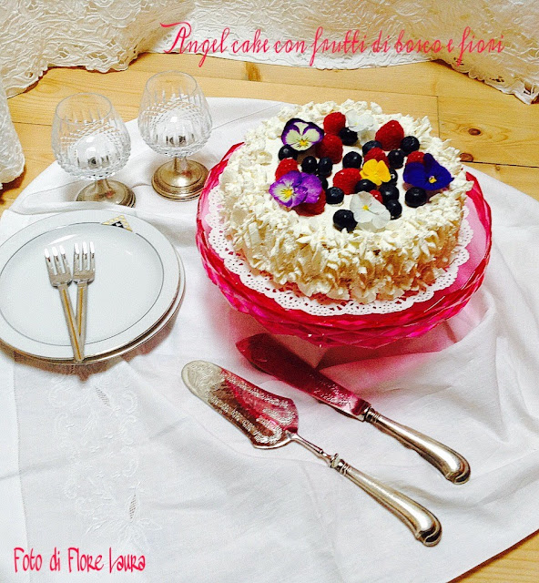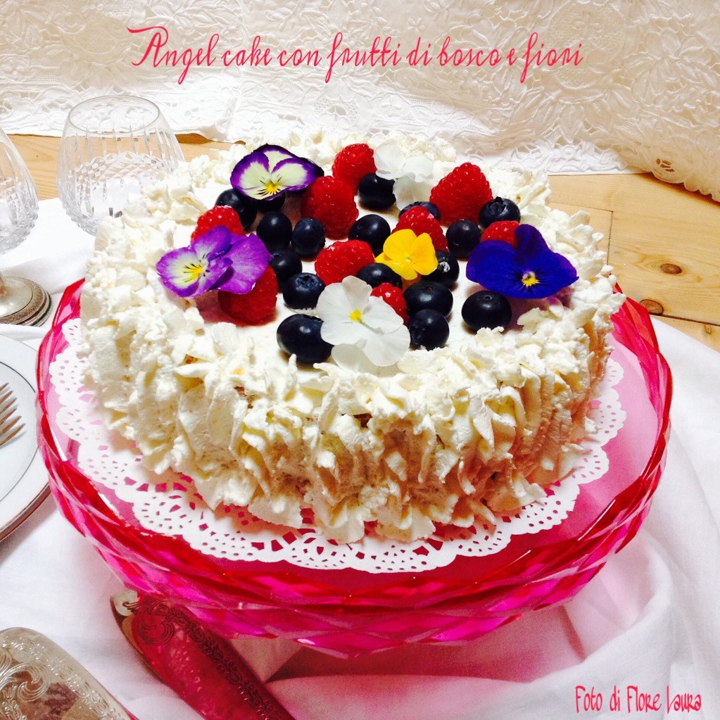 Cari amici, in questo periodo sono troppo presa dal lavoro e sono stata male per una congestione che mi ha scompensato completamente! Sono veramente stanca di non trovare il tempo per le cose che amo di più, come scrivere sul mio amato blog, realizzare i miei lievitati e dolci coccole per tutte voi. Mi piace condividere e leggere i vostri commenti: è come essere parte di una grande famiglia! Il giorno della festa della mamma ho realizzato una dolcissima e fantastica Angel Cake con frutti di bosco e fiori, ma non sono riuscita a pubblicarla. Mi sembrava un peccato non farlo e allora oggi ho trovato il tempo di scivere questo post e pubblicarla perchè ne vale veramente le pena, credetemi. Pensate che mi sono lasciata prendere dall’estro di decorarla con la sac a poche (è stata la mia prima volta!). Pensavo di combinare un disastro e invece mi sono stupita di me. Non sarà perfetta ma io la trovo incantevole, me ne sono perdutamente innamorata. Una torta deliziosa, fresca, leggera e soffice come una nuvola! Perfetta per festeggiare un compleanno, un evento importante, una cena elegante per stupire i vostri ospiti e credetemi farete davvero un figurone! Mi sono ispirata alla ricetta tratta dalla rivista “Da Noi” di Esselunga.
