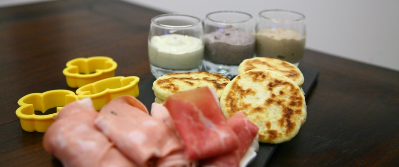Mettere le salse in piccoli bicchieri da finger food e servire le tigelle accompagnate da salumi.