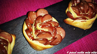 Oggi vi propongo un antipasto velocissimo da preparare e molto carino da portare in tavola: Le rose di pasta sfoglia ai wurstel.