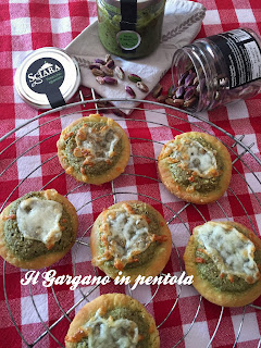 Stendiamolo con il mattarello e con uno stampino tondo ricaviamo le pizzette e condiamole con un cucchiaino di pesto ciascuna.