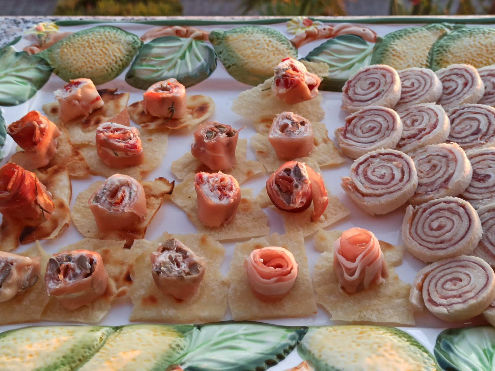 - Rotolini di speck spalmati di Philadelphia + olivette sarde in alcuni e pomodori secchi in altri, poi appoggiati su pezzetti di pane carasau,